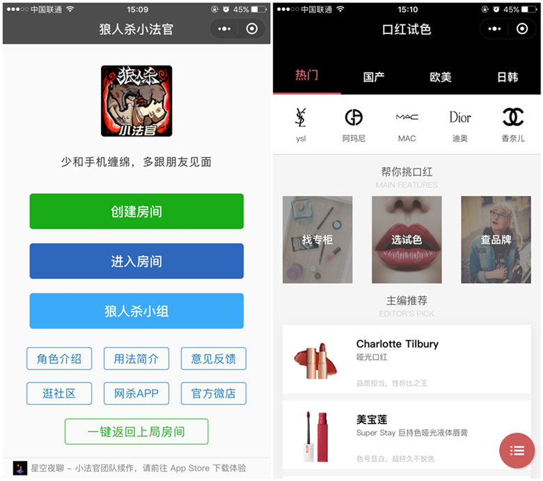 互動(dòng)功能類小程序是近期刷屏最多的小程序,包含了匿名悄悄話、匿名吐槽、游戲助手(狼人殺等)、口紅試色等。