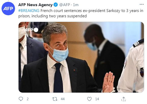 法國(guó)前總統(tǒng)薩科齊以貪污罪被判有期徒刑3年