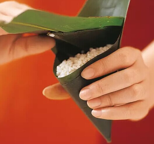 ?雙手捏住粽葉兩端,同時向內(nèi)交叉重疊,折成漏斗形,然后將內(nèi)側的粽葉在漏斗內(nèi)旋轉1圈,再回到原來的位置,使漏斗變成圓錐形。