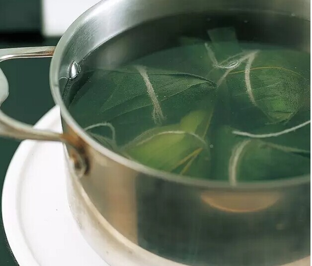 剛入夏,菜市場上就已經(jīng)遍布綠油油的粽葉了,選表面光滑軟韌的較好。粽葉買回來之后就要放在清水中浸泡, 用前先用水煮一下, 讓粽葉變軟,韌性更強,包粽子時候不容易破裂。