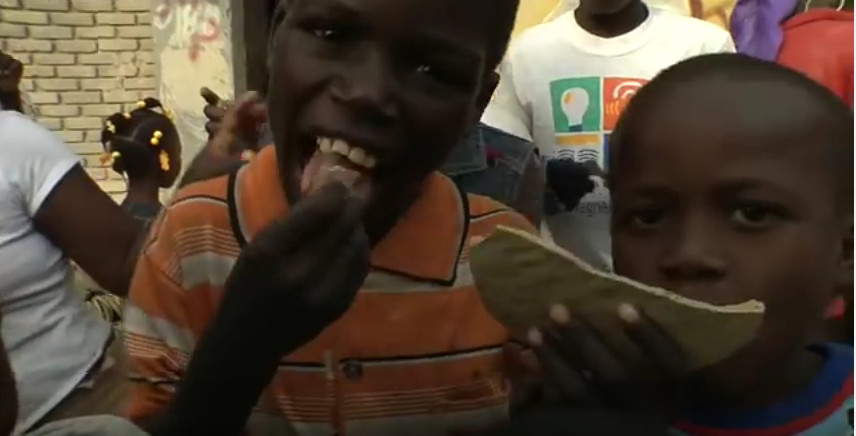 在海地,人們將濾去碎石和土塊的泥漿加入鹽攪拌,并用勺子把厚重的泥漿攤成餅狀,然后把它們放在太陽下曬干。在當(dāng)?shù)氐氖袌錾狭X可以買5個(gè)泥餅。