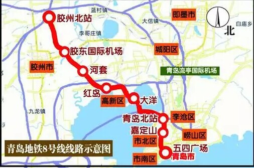 8號(hào)線連結(jié)了膠州市和市南區(qū)、市北區(qū)、李滄區(qū)