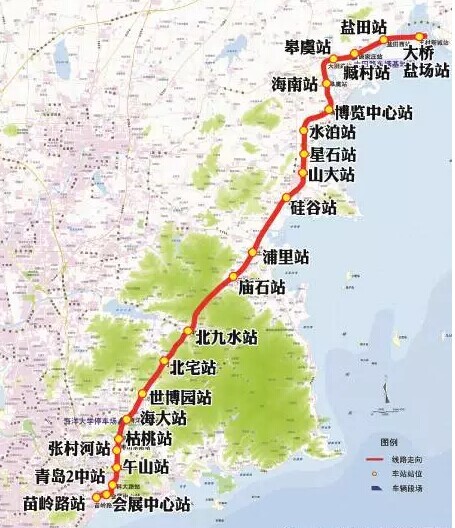 青島地鐵11號(hào)線全長(zhǎng)約58公里,起點(diǎn)為嶗山區(qū)苗嶺路和深圳路交叉口處,終點(diǎn)為即墨市大橋鹽場(chǎng),線路以高架敷設(shè)為主,設(shè)車站22座,即墨段于2015年全面開展施工。
