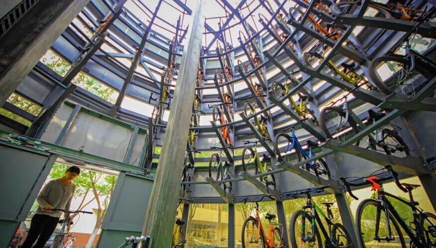 據(jù)了解,該存車(chē)樓主體為高8米,直徑8米的圓筒狀鋼結(jié)構(gòu),可存放120輛20-26英寸的自行車(chē),通過(guò)刷身份證、學(xué)生卡可將自行車(chē)快速便捷的存放在車(chē)庫(kù)內(nèi)。