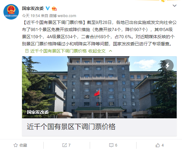 從國家發(fā)改委獲悉,截至9月28日,各地已出臺實施或發(fā)文向社會公布了981個景區(qū)免費(fèi)開放或降價措施(免費(fèi)開放74個,降價907個),其中5A級景區(qū)159個,4A級景區(qū)534個,二者合計693個,占70.6%。