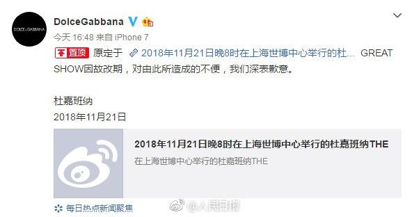 面對大眾“零容忍”的態(tài)度,杜嘉班納于21日下午宣布在上海舉辦的時裝秀“因故改期”。
