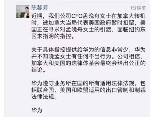 對此,華為董事、高級副總裁陳黎芳在朋友圈回應(yīng)確有此事。她表示,近期,公司CFO孟晚舟女士在加拿大轉(zhuǎn)機時,被加拿大當(dāng)局代表美國政府暫時扣留,美國正在尋求對孟晚舟女士的引渡,面臨紐約東區(qū)未指名的指控。