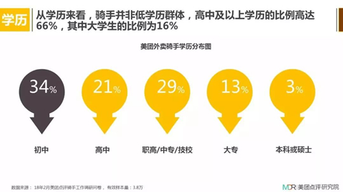 從美團點評研究院發(fā)布的《2018年外賣騎手群體研究報告》中我們可以看到,從事騎手職業(yè)的人通常來自小城市且文化水平偏低,這就導(dǎo)致騎手在與消費者交流中常因為缺乏溝通技巧產(chǎn)生爭執(zhí)。也親眼見過騎手去咖啡店取餐,因為對咖啡不了解,普通話又不好,溝通浪費了很長時間,過程中遭店員頻繁白眼。