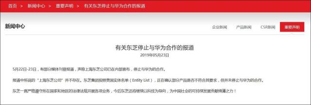 東芝中國(guó)官網(wǎng)23日發(fā)表一份聲明說(shuō),有部分媒體稱上海東芝公司已在內(nèi)部宣布停止與華為的合作,但報(bào)道中所說(shuō)的“上海東芝公司”并不存在。東芝集團(tuán)“并未停止與華為的合作”。