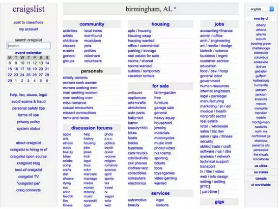 我通常用Craigslist的案例來分析。正如上圖你所看到的,這個網(wǎng)站的主頁就是一堆藍色的文字鏈,設(shè)計者把他們按照一定的分類進行排放,這種設(shè)計就像1999年互聯(lián)網(wǎng)剛開始興起時的風(fēng)格樣式。