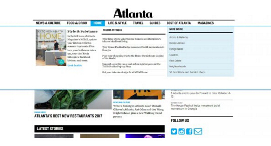 Atlanta Magazine 的大型導(dǎo)航菜單給人的體驗(yàn)就非常流暢,下拉菜單中嵌入了大量的鏈接。由于響應(yīng)式的滑動導(dǎo)航在移動端上也已經(jīng)很常見了,這使得它還輕松兼顧到了移動端的設(shè)計。