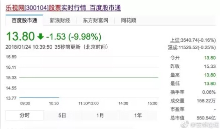 樂視網(wǎng)股票今天上午正式復牌,停牌前的股價為15.33元。就跟寫好的劇本一樣,開盤直接跌停,18萬“韭菜”股民被套。根據(jù)投行預測,樂視網(wǎng)股價將下跌75%至3.7元。就如同當初看好樂視瘋狂投資時一樣,如今股民們也將跟隨賈躍亭一起窒息到底。