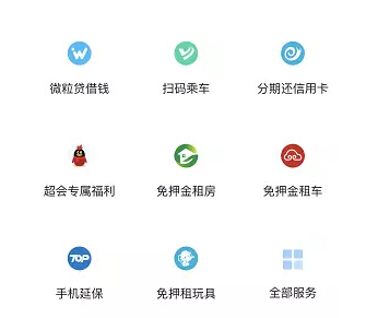 微粒貸借錢、掃碼乘車、分期還信用卡、超會專屬福利、免押金租房、免押騎摩拜、免押金租車、手機延保等眾多服務。