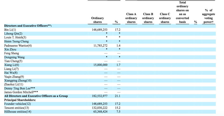 招股書顯示,IPO前,蔚來汽車的前三大股東分別為公司創(chuàng)始人、董事長李斌(持股17.2%),騰訊(持股15.2%)和高瓴資本(持股7.5%)。另外,蔚來汽車北美CEO Padmasree Warrior 持股1.4%,車和家創(chuàng)始人李想持股1.7%。