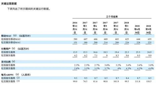 騰訊音樂(lè)招股書(shū)顯示,截至截至2018年9月30日,騰訊音樂(lè)在線音樂(lè)付費(fèi)用戶(hù)為2490萬(wàn)人,付費(fèi)率達(dá)到3.8%,社交娛樂(lè)付費(fèi)用戶(hù)990萬(wàn),付費(fèi)率為4.4%。付費(fèi)轉(zhuǎn)化率不及Spotify的1/10。
