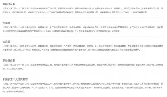 除了被公司辭退,在法律層面腐敗犯罪究竟會面對怎樣的刑罰?北京師范大學(xué)中國刑法研究所副所長彭新林此前表示,在2014年到2017年,民營企業(yè)腐敗犯罪中,共包括15個罪名,其中最主要的就是單位行賄罪、職務(wù)侵占罪、挪用資金罪、非國家工作人員受賄罪和行賄罪。